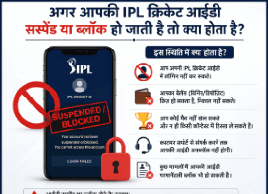 आईपीएल क्रिकेट आईडी ऑनलाइन प्लेटफॉर्म्स पर यूज़र की एक आईडी होती है, जिसके जरिये वह लॉगिन करके अपनी बेटिंग गतिविधियाँ करता है। अगर यह आईडी ससपेंड या ब्लॉक हो जाती है,तो इसके कई सीधे प्रभाव पड़ते हैं।